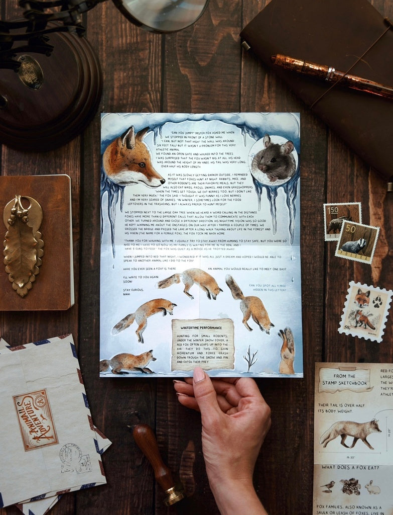 Open your mailbox to find an envelope with a beautifully illustrated letter, a sketchbook page with animal drawing instructions, a double-sided map, and much more!